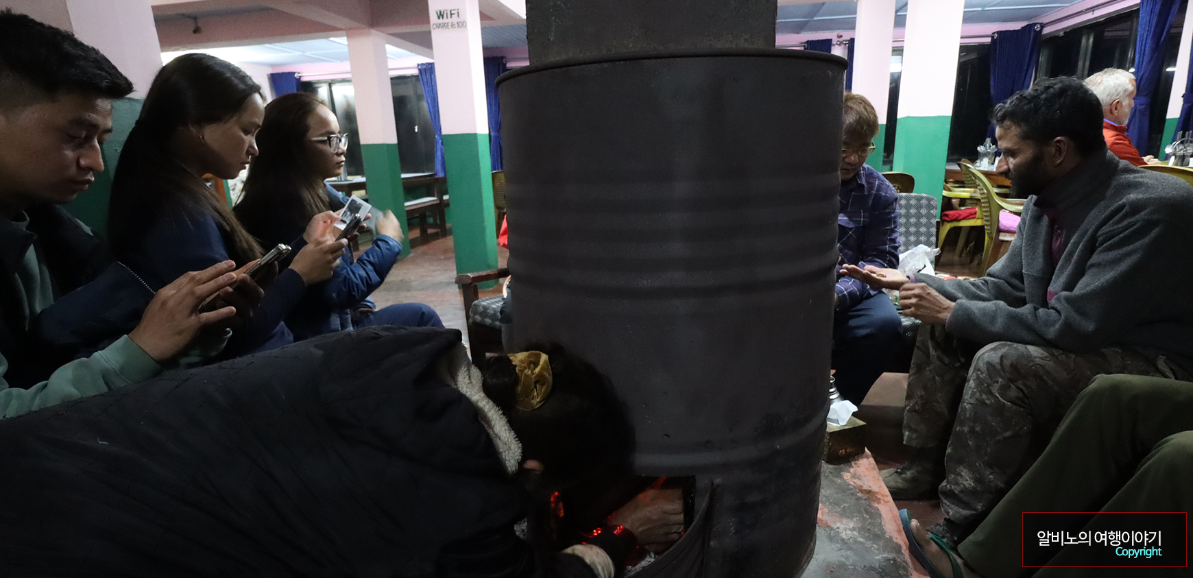 저녁 식사 전후에 숙박하는 많이 사람들이 난로가에 앉아 있다. 실외에 나가보니 제법 날씨가 춥다.