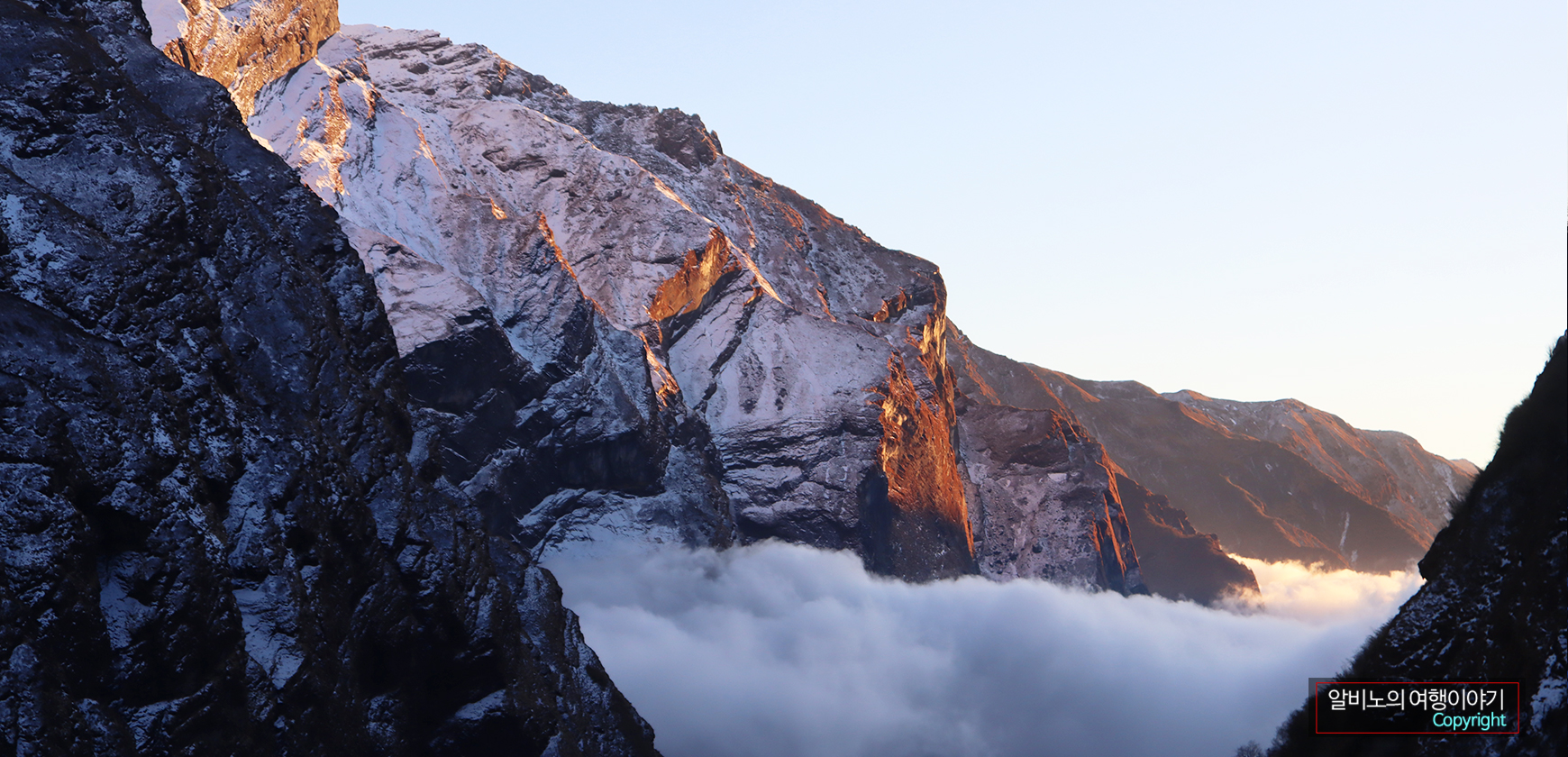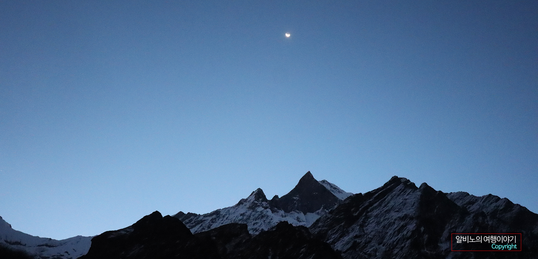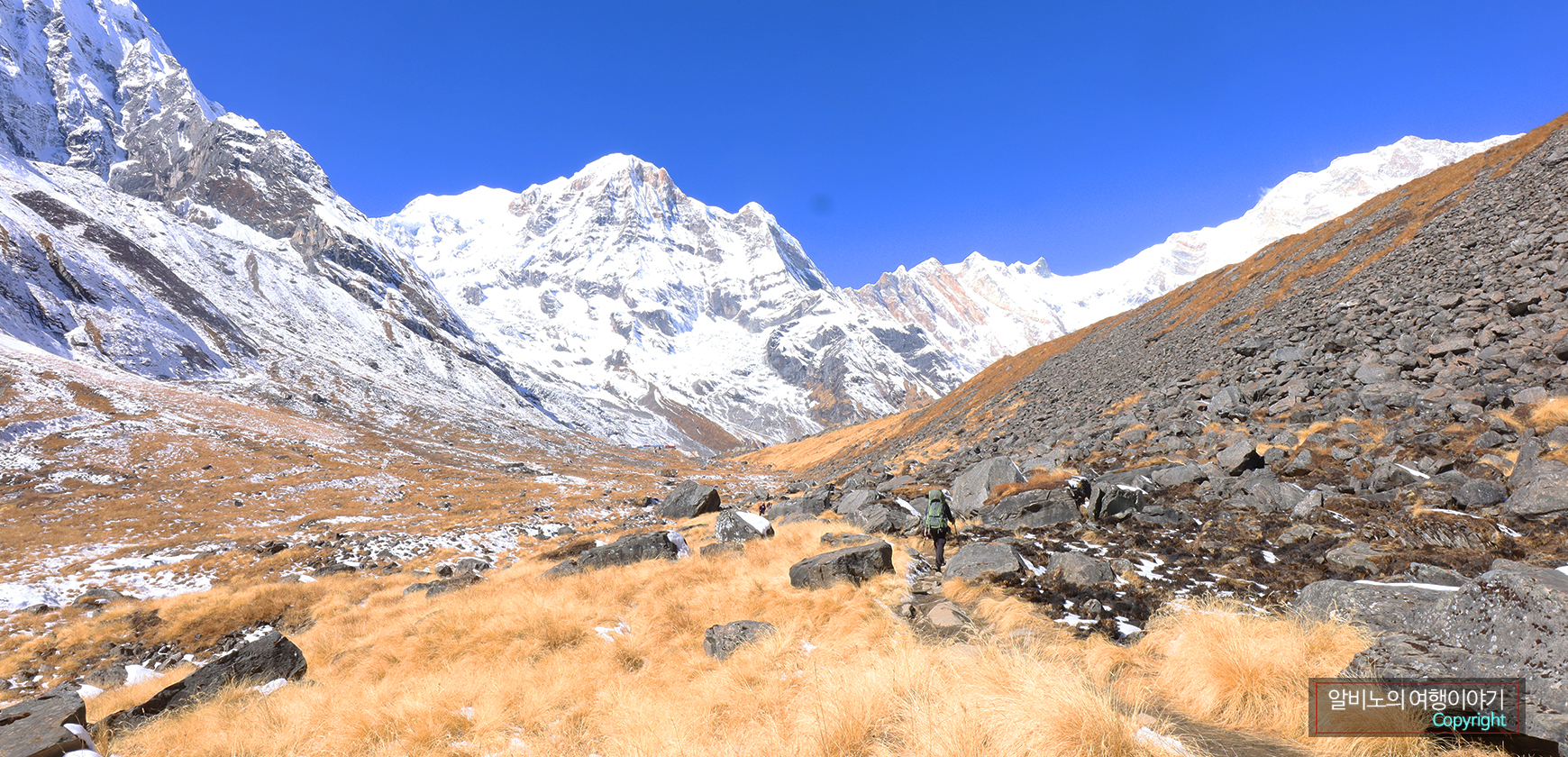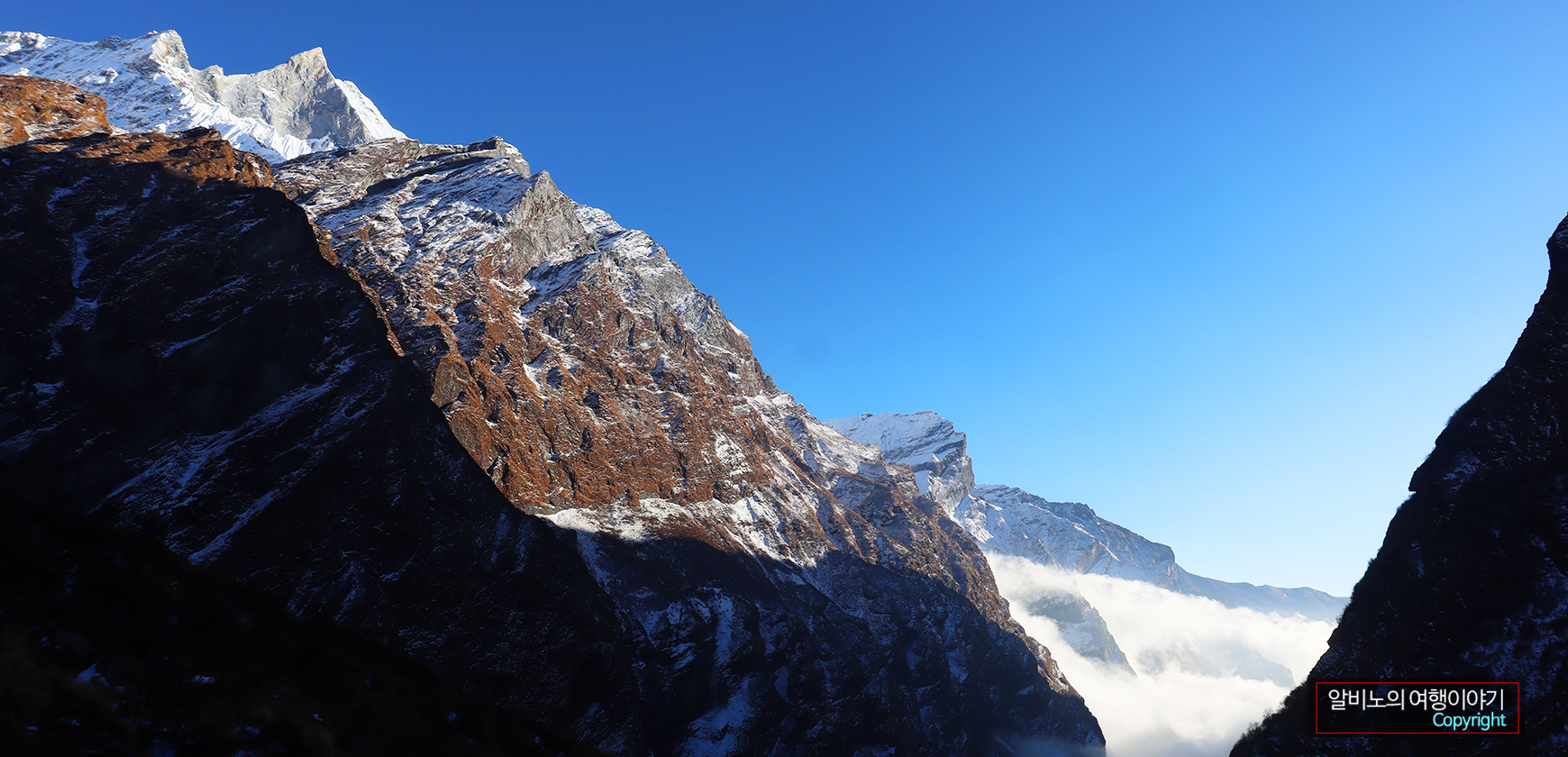 MBC에서 위쪽으로 보아도 ABC는 산에 가로막혀 시야에 들어오지 않았다. 그래도 ABC 주변의 고봉들이 눈앞에 펼쳐진다. 이제 반나절만 올라가면 목적지에 다다르게 된다. 가슴이 설렌다.