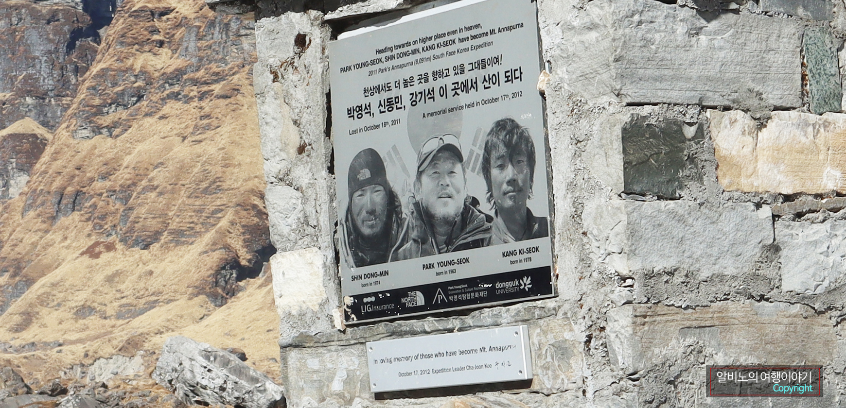 눈에 띄는 것은 2011년 10월, 안나푸르나 남벽 등정 도중 신동민·강기석 대원과 함께 실종된 산악인 박영석의 추모비였다. 추모비 앞에 담배 한 개비 불에 붙여 놓아두고 절을 했다.