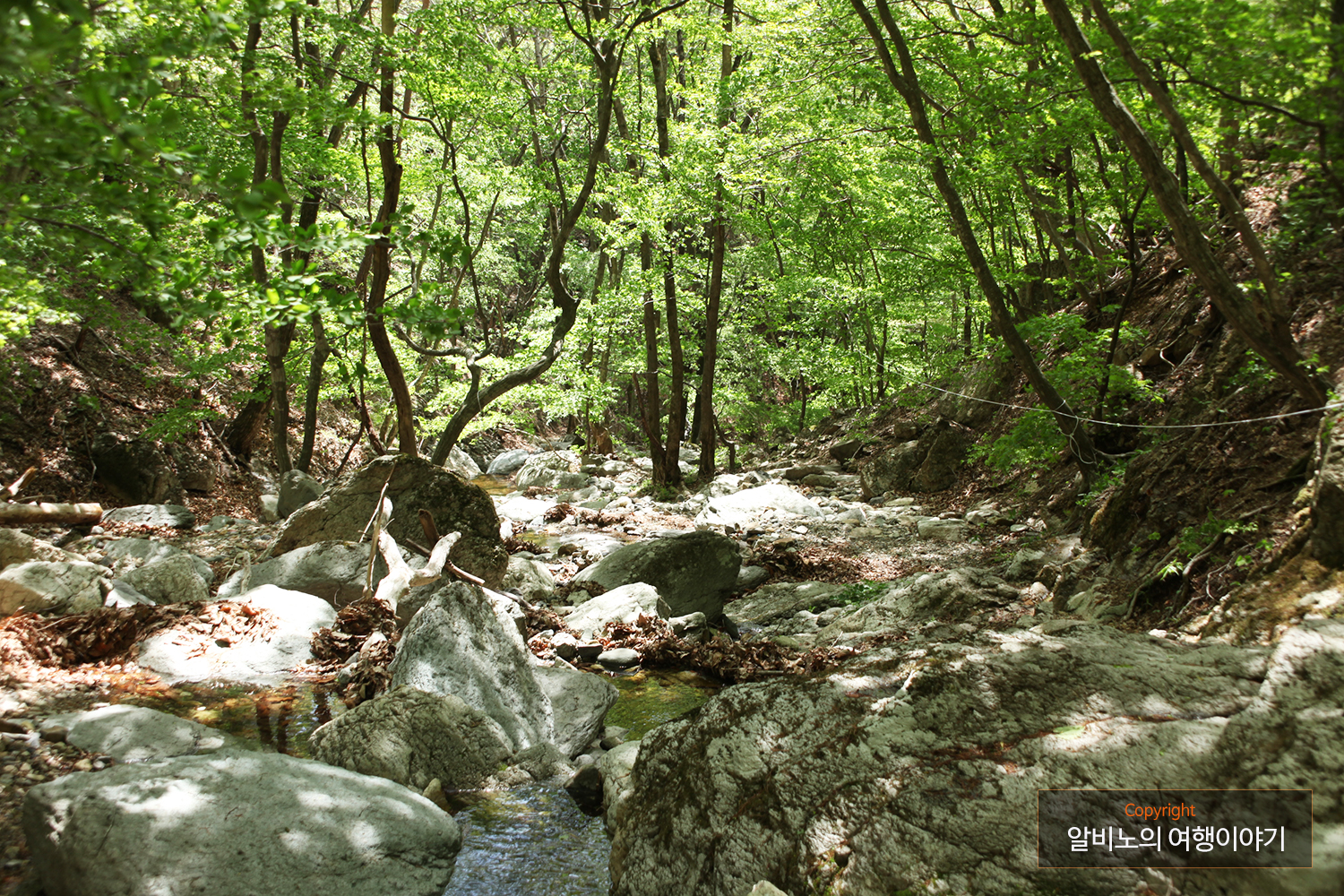 계곡은 길의 윤곽이 분명치 않음으로  길을 잃지 않도록 조심해야 한다. 다행히 사진의 오른쪽에서 보이듯