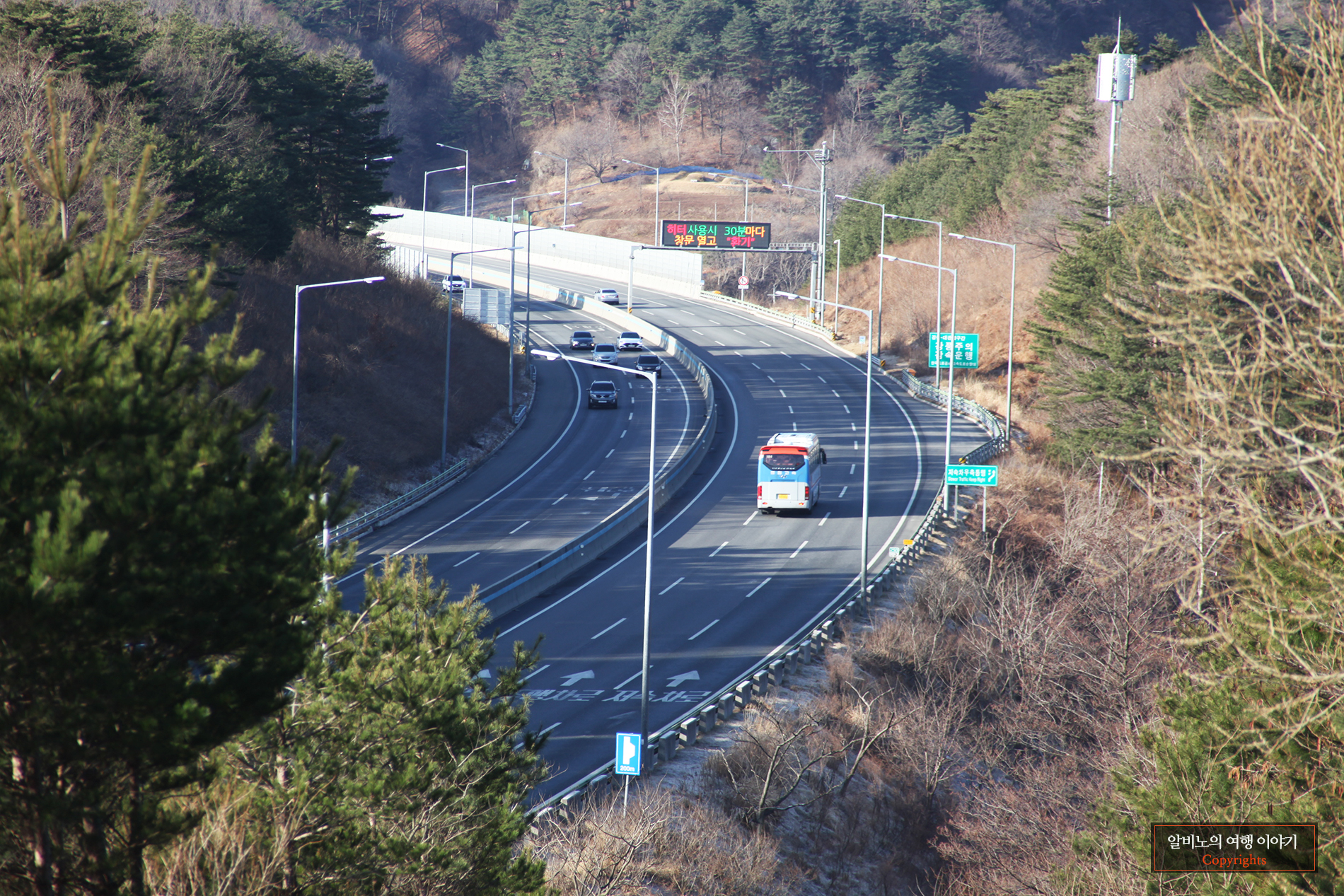 대관령 휴게소 부근을 도보로 걸어서 가며 고속도로위를 달리는 차들을 본다.
