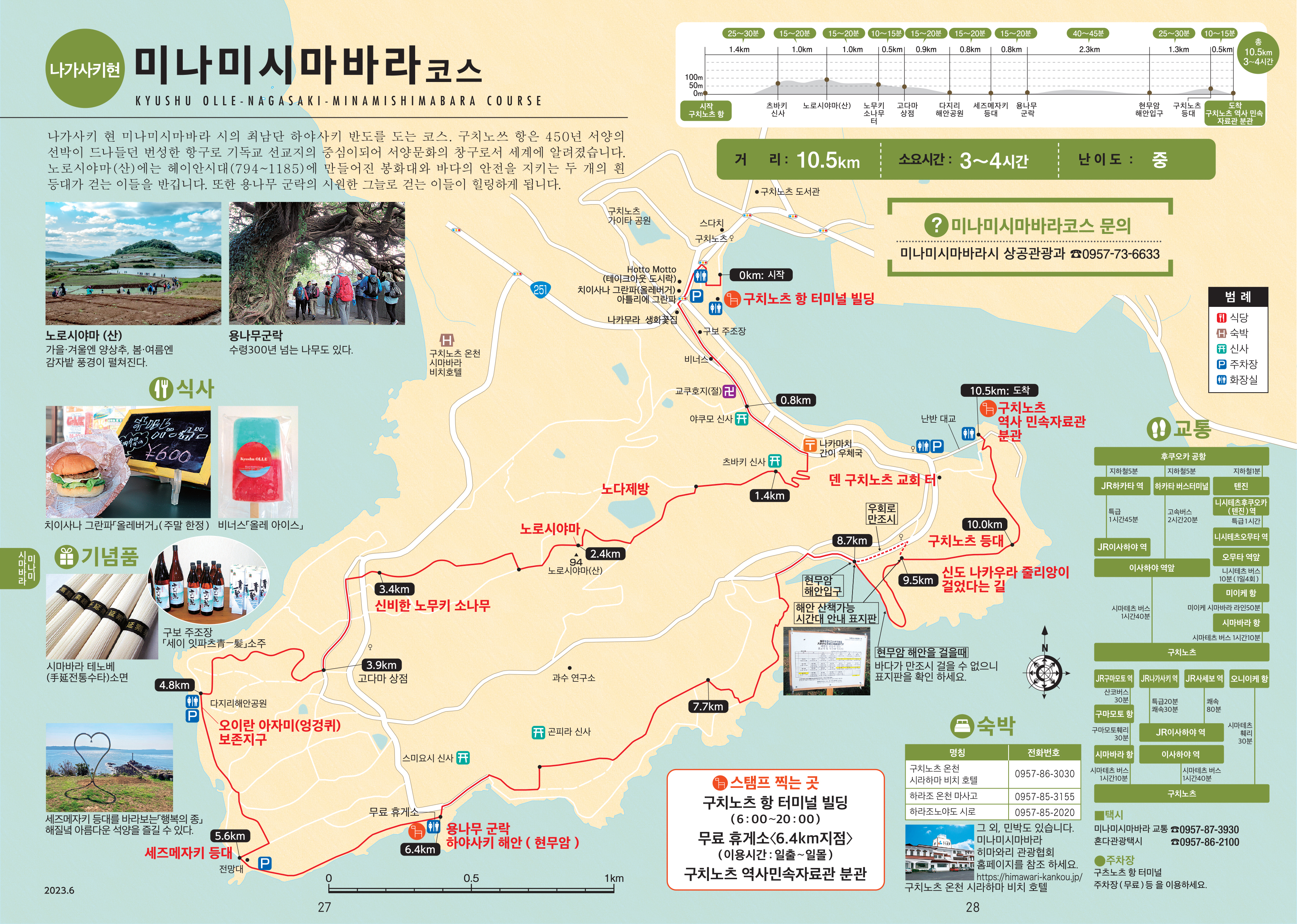 ( 구치노쓰 항→ 야쿠모신사(0.8km)→ 풍유갓파상 (1.1km)→ 노다제방(1.9km)→ 노로시야마산 (2.4km)→ 환상의 노무키 소나무 (3.4km)→ 다지리 해안 (4.8km)→ 세즈메자키 등대 (5.6km)→ 용나무 군락 (6.4km)→ 구치노쓰 등대 (10.0km)→ 구치노쓰 역사 민속 자료관 (10.5km)